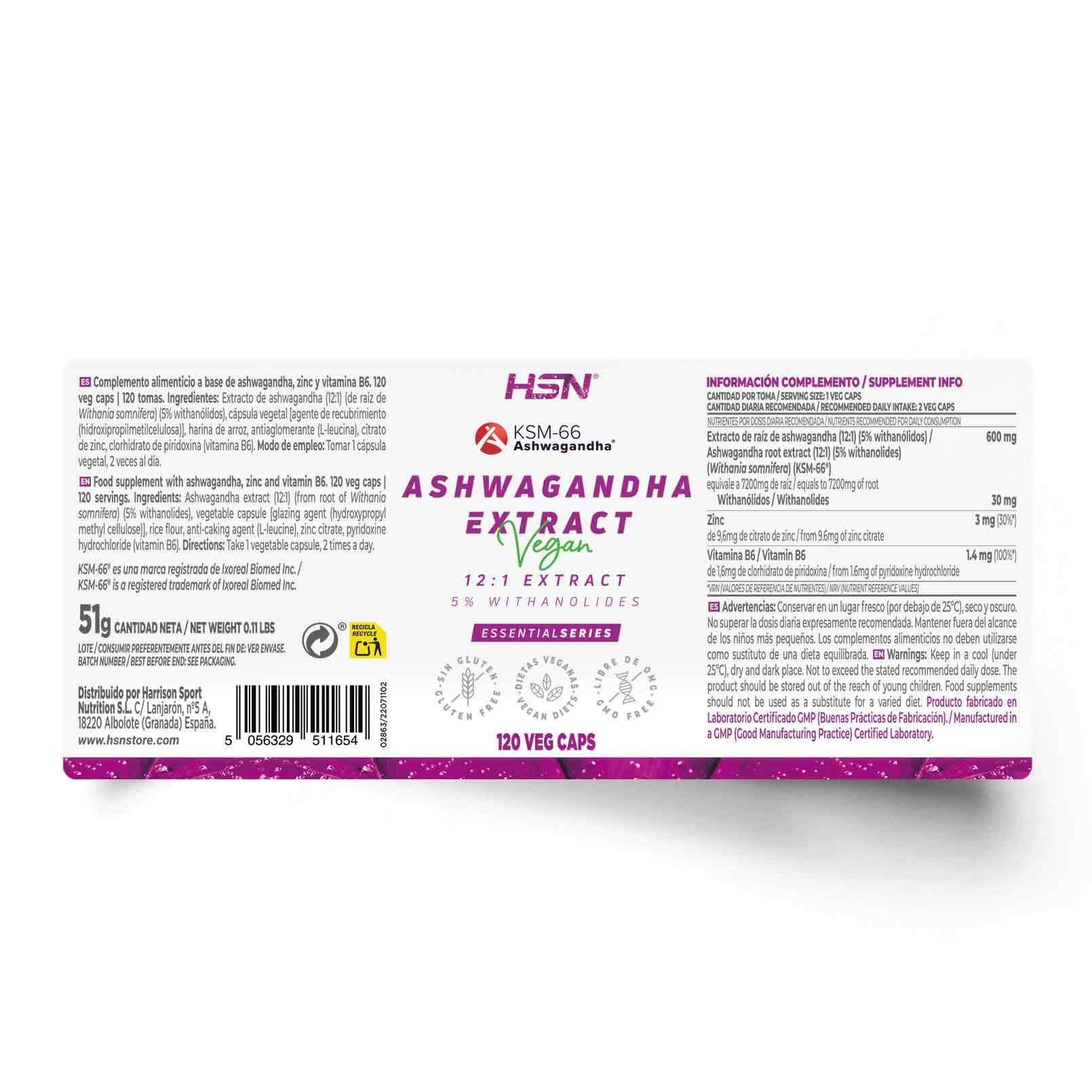 Ashwagandha extract (12:1, from Withania somnifera root, 5% withanolides), vegetable capsule [coating agent (hydroxypropyl methylcellulose)], rice flour, anti-caking agent (L-leucine), zinc citrate, pyridoxine hydrochloride (vitamin B6).