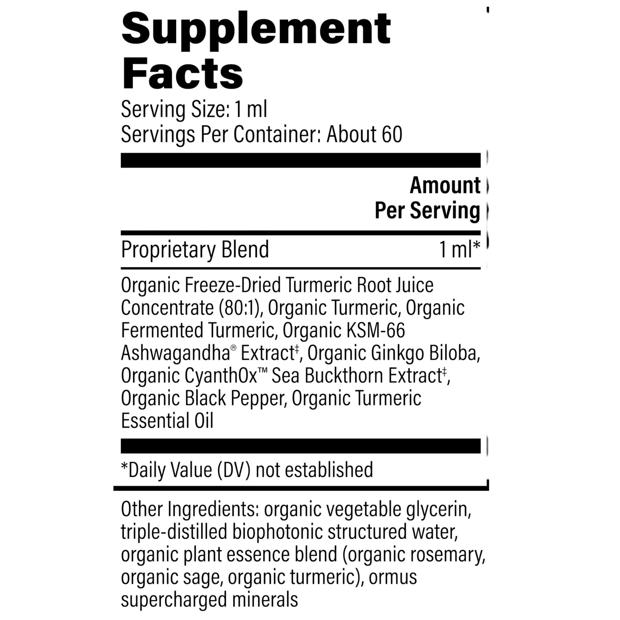 Organic Freeze-dried Turmeric Root Juice Concentrate (80:1), Organic Turmeric, Organic Fermented Turmeric, Organic KSM-66 Ashwagandha Extract, Organic Ginkgo Biloba, Organic CyanthOx Sea Buckthorn Extract, Organic Black Pepper, Organic Turmeric Essential Oil