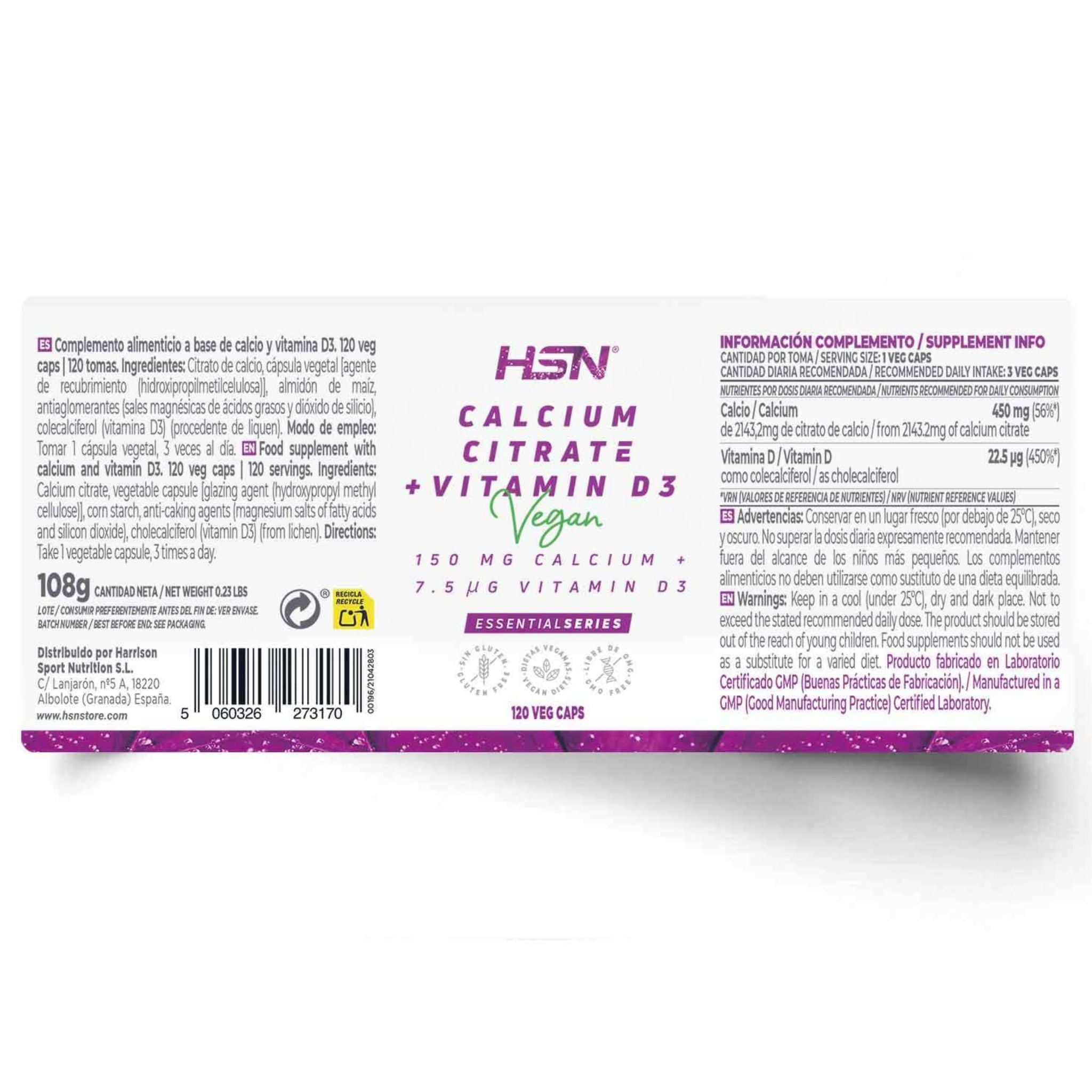 Calcium citrate, vegetable capsule [glazing agent (hydroxypropyl methyl cellulose)], corn starch, anti-caking agents (magnesium salts of fatty acids and silicon dioxide)], maltodextrin, cholecalciferol (vitamin D3 from lichen).