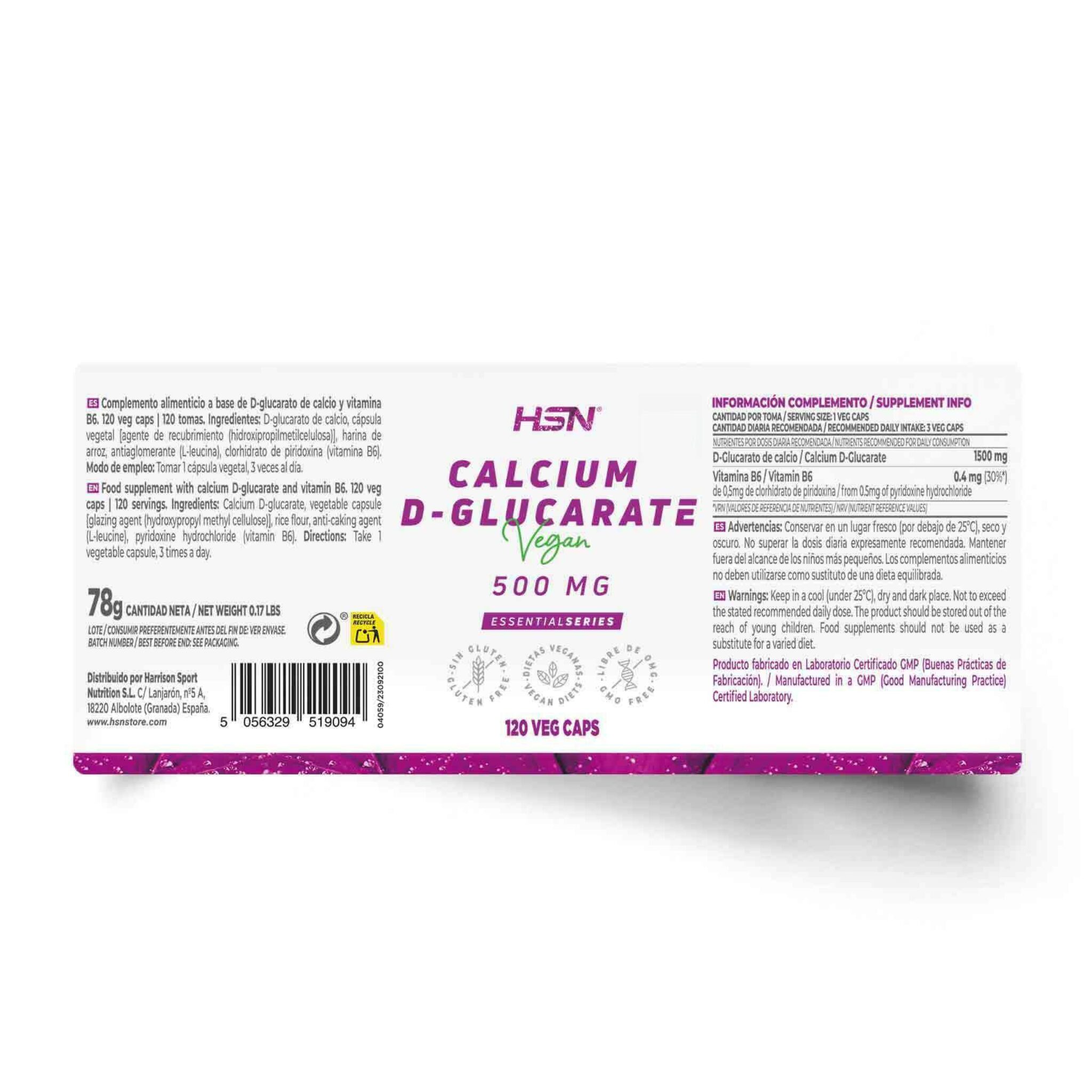 Calcium D-glucarate, vegetable capsule [glazing agent (hydroxypropyl methyl cellulose)], rice flour, anti-caking agent (L-leucine), pyridoxine hydrochloride (vitamin B6).