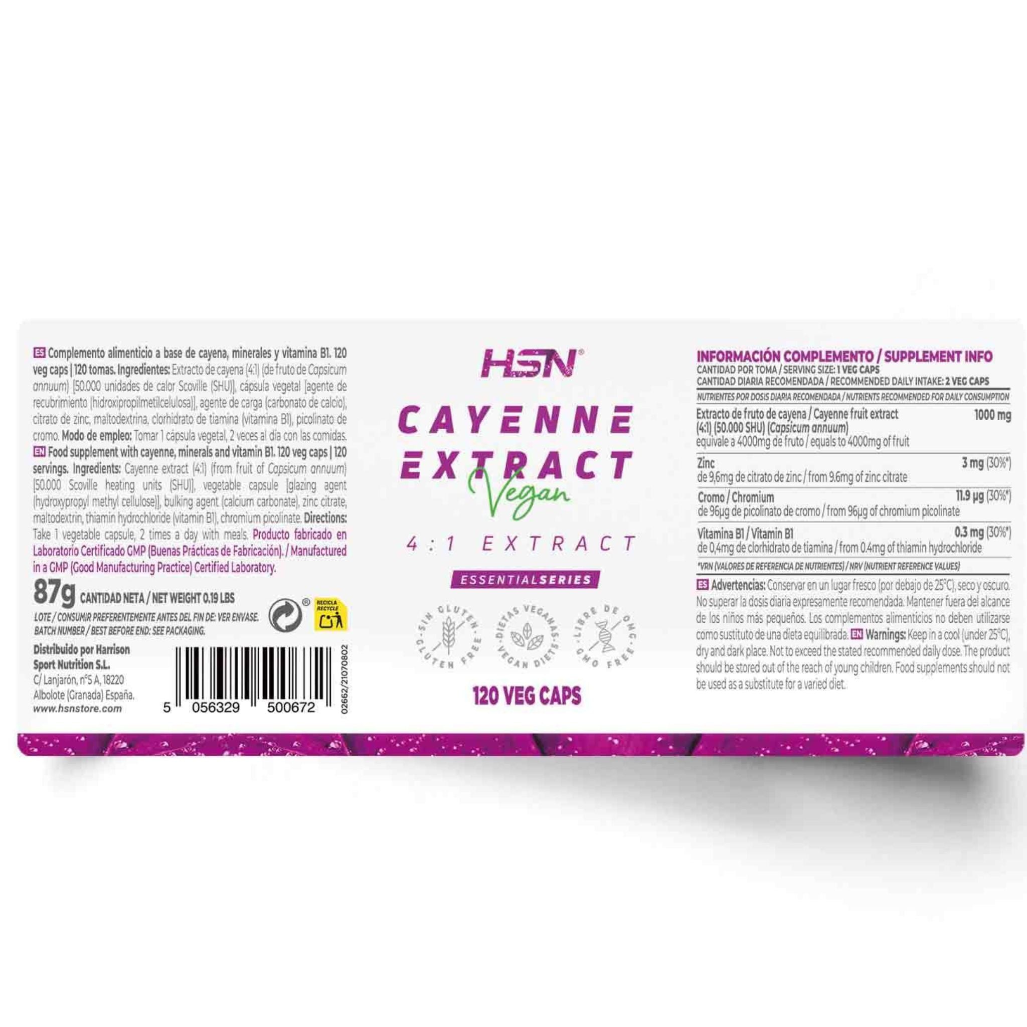 Cayenne extract is known to support metabolism by stimulating fat and carbohydrate oxidation, reducing calorie intake, and increasing energy expenditure. Each serving provides 500 mg of 4:1 Cayenne extract standardized to 50,000 heat units (SHU), combined with Zinc, Chromium, and Vitamin B1. Free from stimulants, this formula is suitable for both vegan and vegetarian diets.