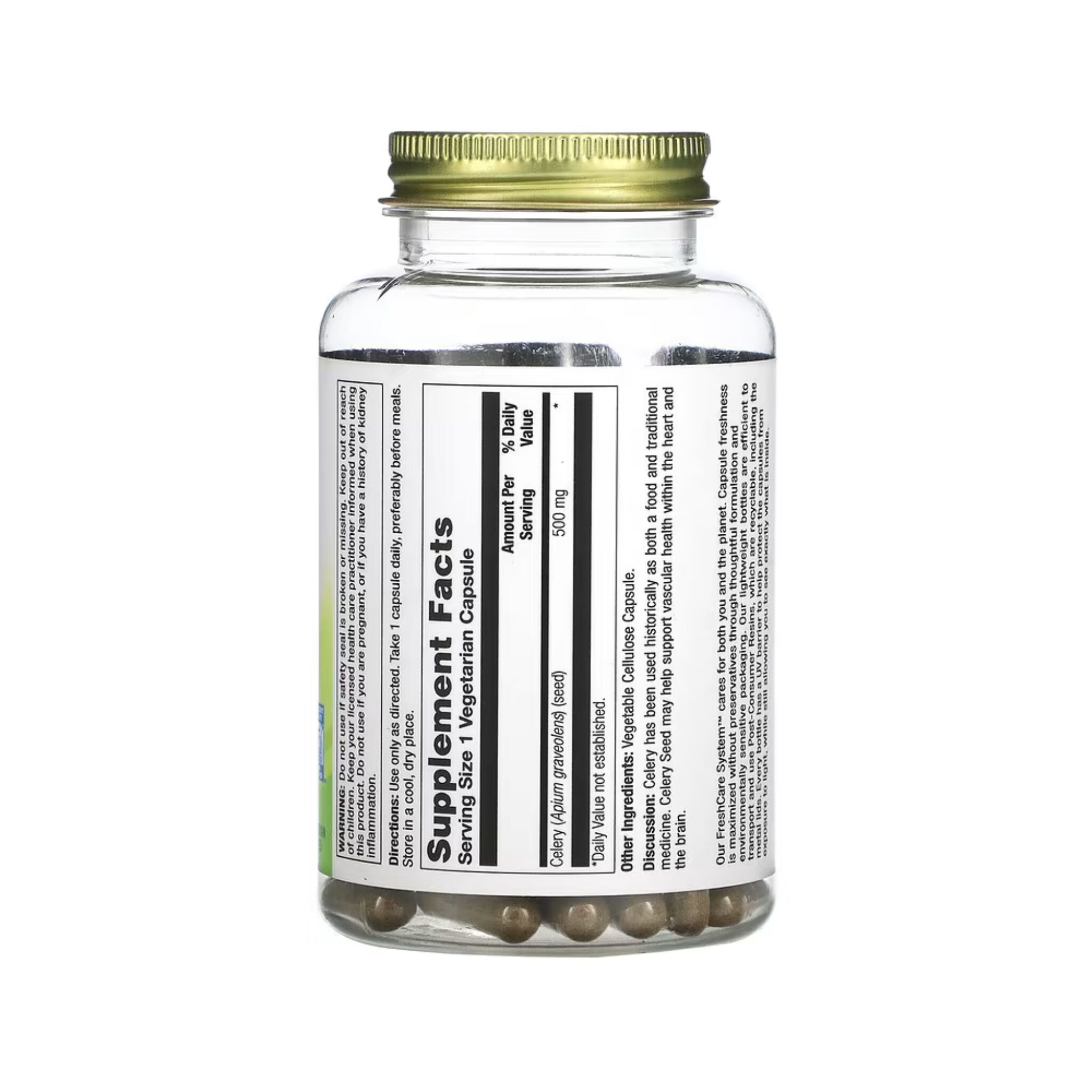 Nature’s Life Celery Seed delivers 500 mg of concentrated celery seed to support proper circulation, blood vessel function, and overall vitality. Valued since ancient Greece, celery seeds are a natural source of trace nutrients such as iron, calcium, and manganese. Research indicates they may help maintain normal blood pressure levels already within a typical range by assisting the body’s natural processes for removing excess salt and minimizing fluid buildup. Rich in flavonoids and plant compounds like coumarin, celery seed may also help protect cells from free-radical damage and promote strong blood flow to the brain for cognitive performance and mental stamina. This non-GMO, vegetarian supplement is carefully crafted and packaged using the environmentally mindful FreshCare System to preserve freshness and potency.