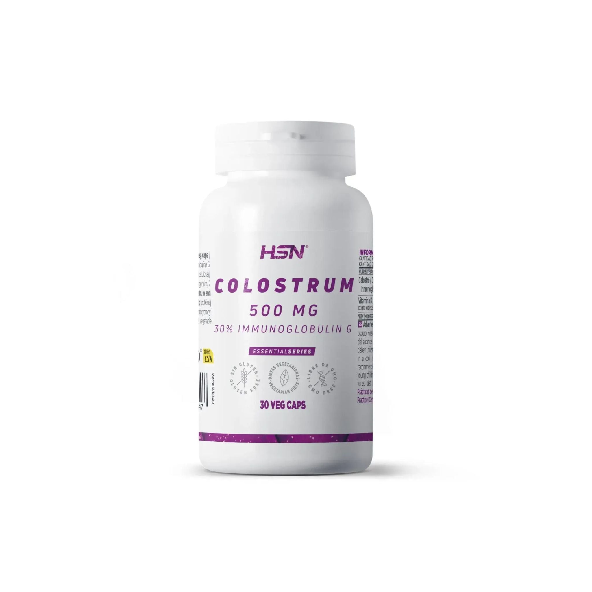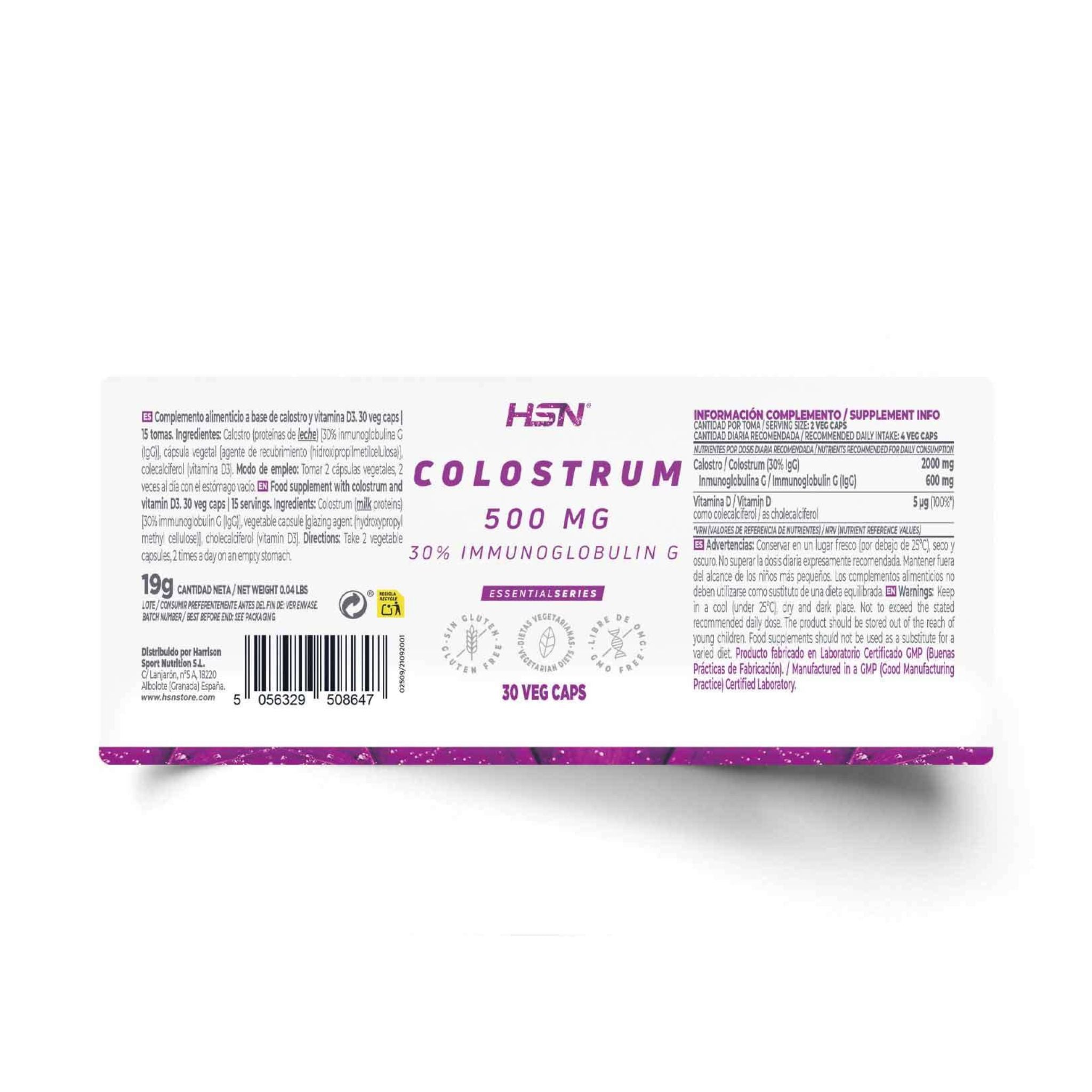 Colostrum [milk proteins, 30% immunoglobulin G (IgG)], vegetable capsule [glazing agent (hydroxypropyl methyl cellulose)], cholecalciferol (vitamin D3).