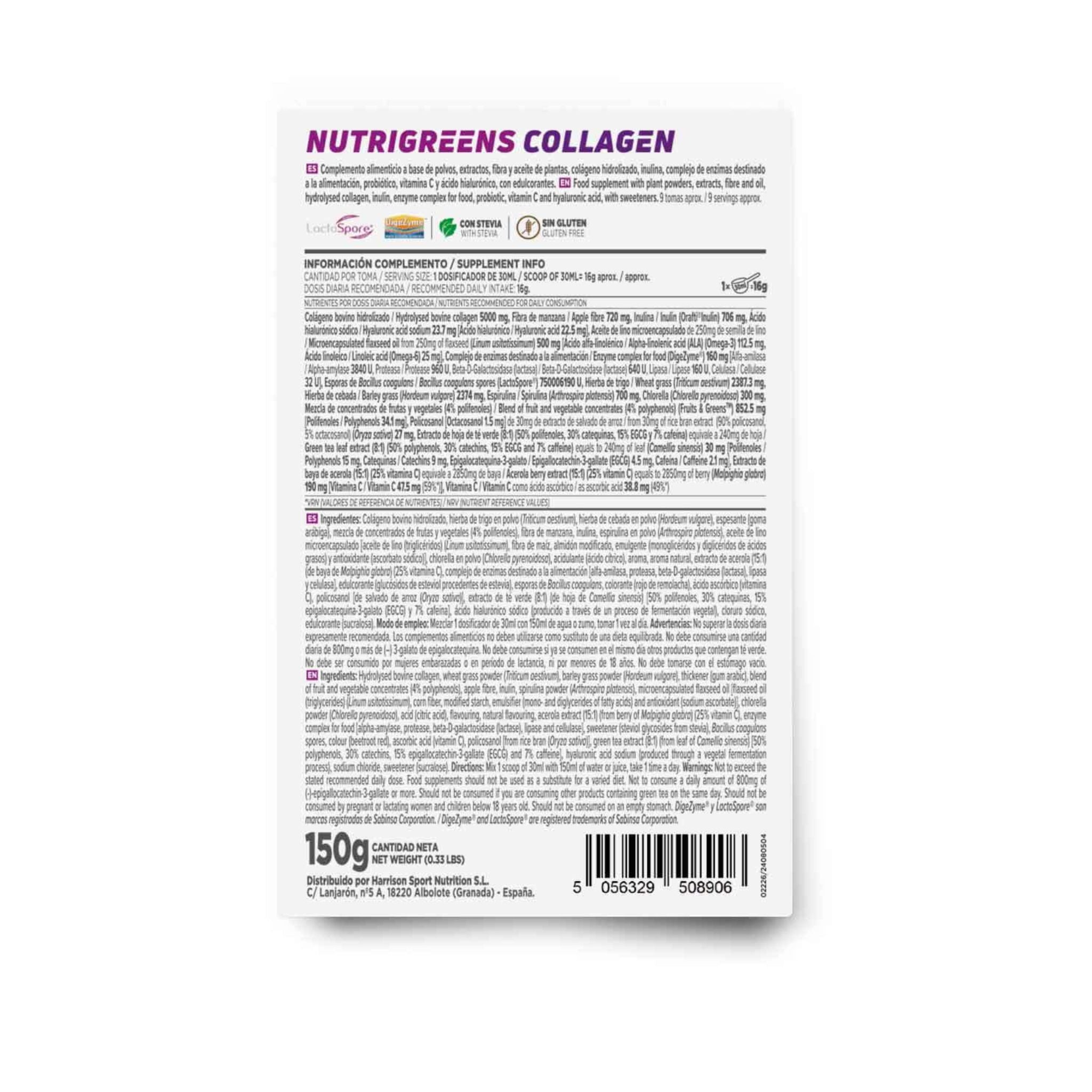 Hydrolysed bovine collagen, wheatgrass powder (Triticum aestivum), barley grass powder (Hordeum vulgare), thickener (gum arabic), blend of fruit and vegetable extracts and concentrates (100:1, 4% polyphenols), apple fibre, inulin, spirulina powder (Arthrospira platensis), microencapsulated flaxseed oil [flaxseed oil (Linum usitatissimum), corn syrup, emulsifier (mono- and diglycerides of fatty acids), antioxidant (sodium ascorbate)], chlorella powder (Chlorella pyrenoidosa), acidulant (citric acid), flavouring, natural flavouring, acerola extract (15:1, from Malpighia glabra berry, 25% vitamin C), enzyme complex for food applications [alpha-amylase, protease, beta-D-galactosidase (lactase), lipase, cellulase], sweetener (steviol glycosides from stevia), Bacillus coagulans spores, colourant (beetroot red), ascorbic acid (vitamin C), policosanol [from rice bran (Oryza sativa)], green tea extract (8:1, from Camellia sinensis leaf) [50% polyphenols, 30% catechins, 15% epigallocatechin-3-gallate (EGCG) and 7% caffeine], sodium hyaluronate (produced through a plant fermentation process), sodium chloride, sweetener (sucralose).