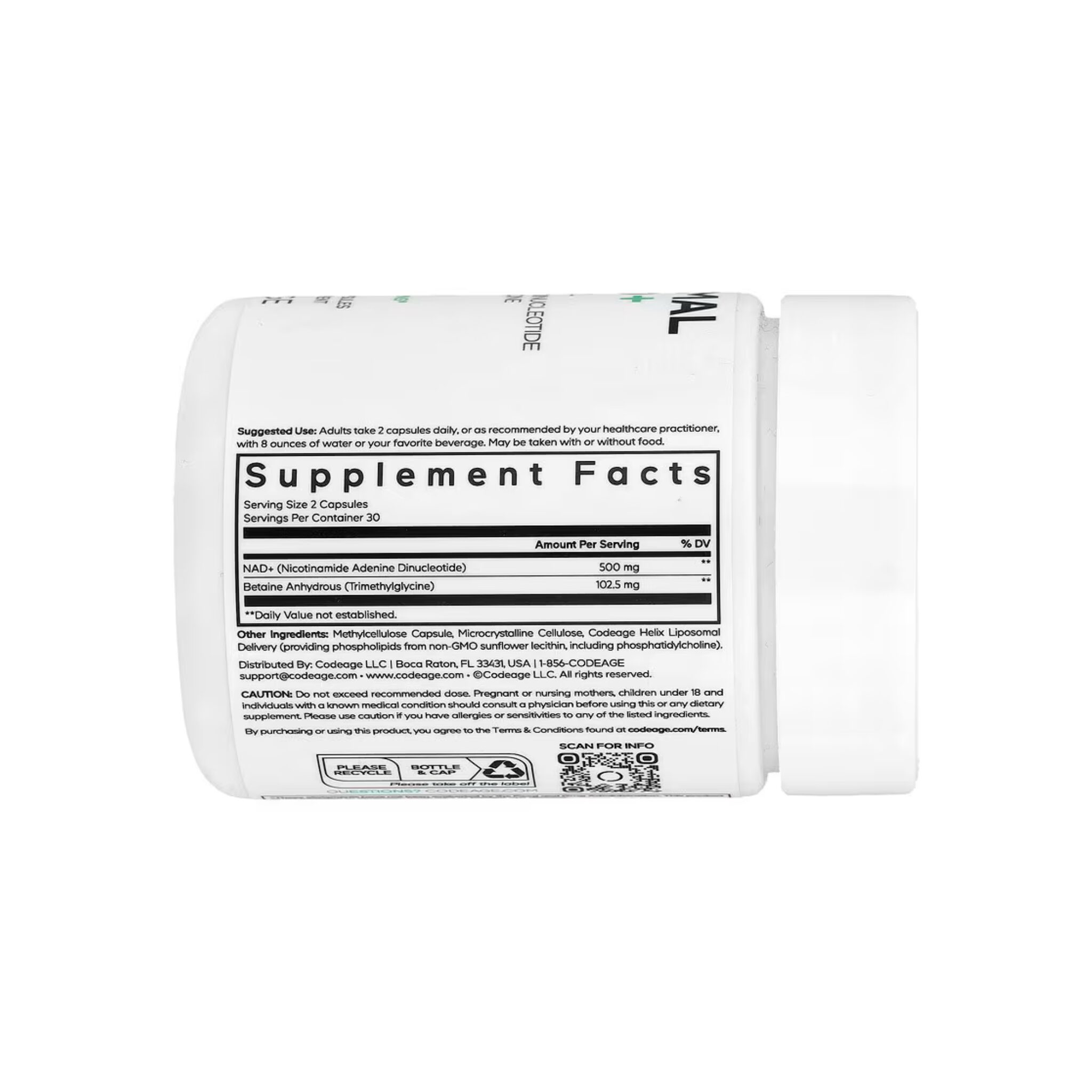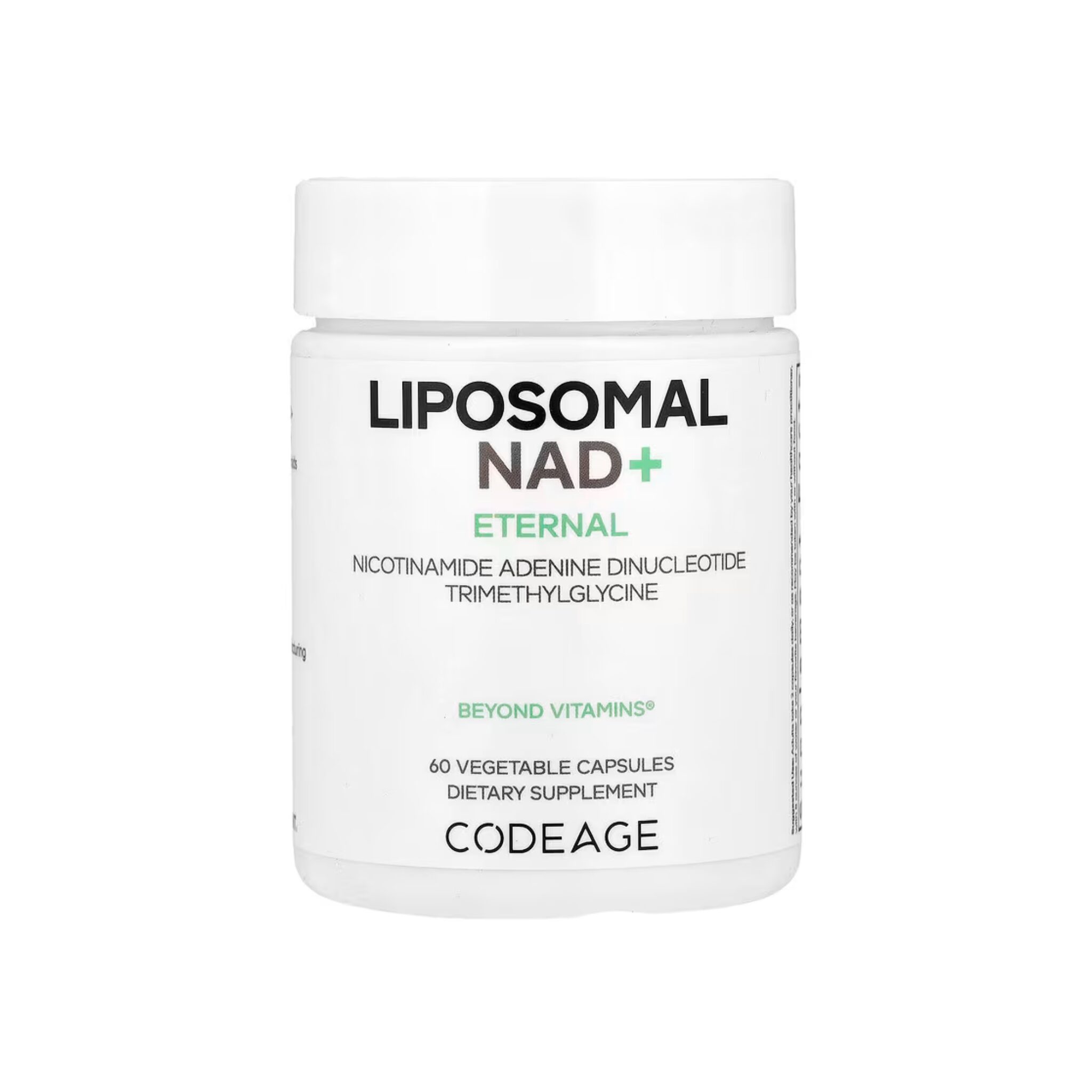 The Codeage Eternal Liposomal NAD+ supplement combines NAD+ with Betaine Anhydrous and utilizes a liposomal delivery system for enhanced absorption. Nicotinamide Adenine Dinucleotide (NAD+) is a coenzyme present in all living cells and plays a key role in numerous biological processes. Boosting cellular NAD+ levels has been shown to enhance mitochondrial function, support the recycling of dysfunctional mitochondria through mitophagy, and improve the regenerative capacity of skin cells. Accumulation of oxidatively damaged proteins in the skin over time can contribute to reduced skin function, which this formula aims to address.