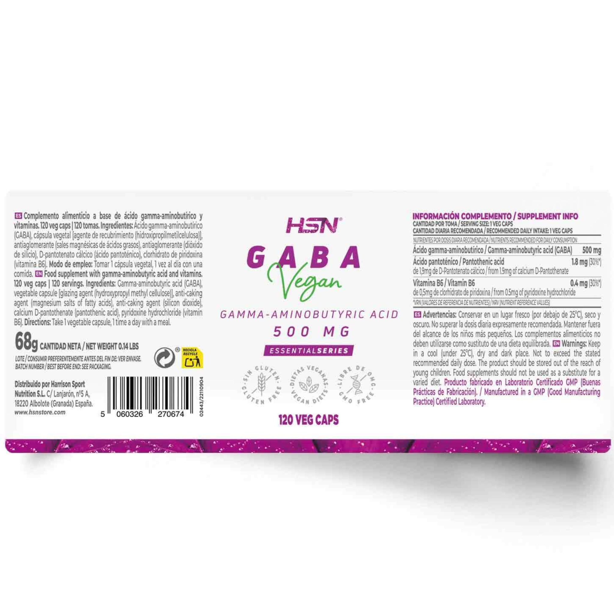 Gamma-aminobutyric acid (GABA), vegetable capsule [glazing agent (hydroxypropyl methyl cellulose)], anti-caking agent (magnesium salts of fatty acids), anti-caking agent (silicon dioxide), calcium D-pantothenate (pantothenic acid), pyridoxine hydrochloride (vitamin B6).