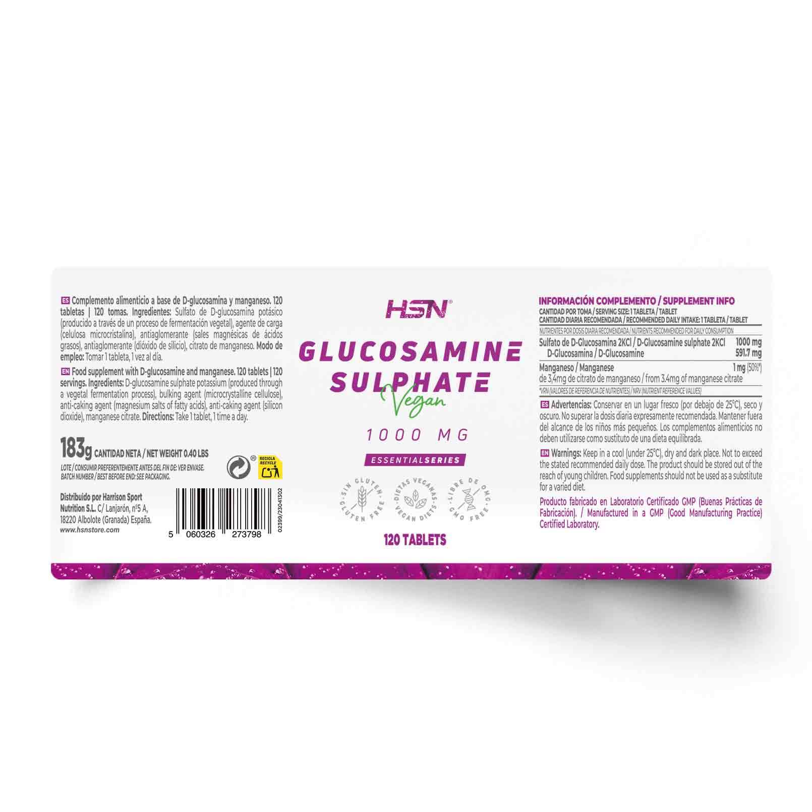 Potassium D-glucosamine sulphate (produced by a vegetable fermentation process), bulking agent (microcrystalline cellulose), anti-caking agent (magnesium salts of fatty acids), anti-caking agent (silicon dioxide), manganese citrate.