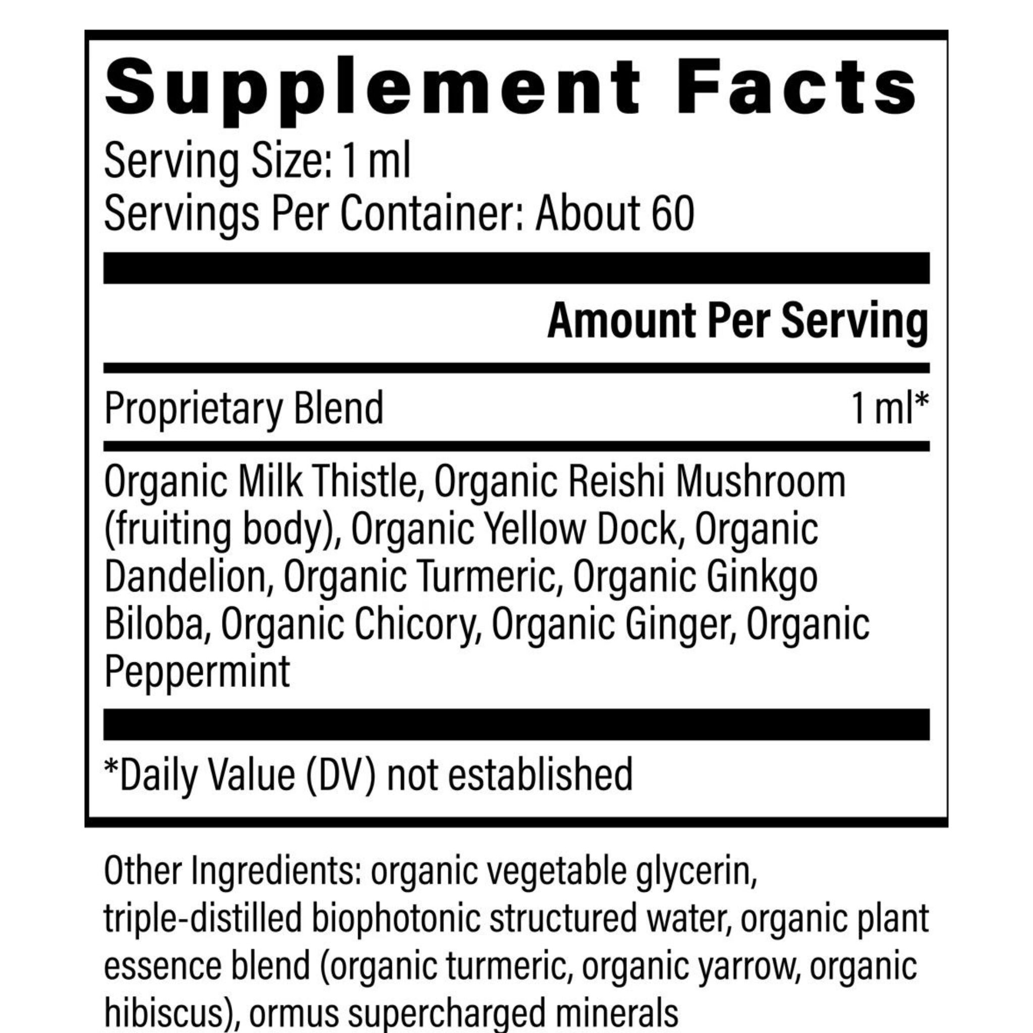 Proprietary Blend: Organic Milk Thistle (seed), Wildcrafted Chanca Piedra (herb), Wildcrafted Borututu (root bark), Organic Reishi Mushroom, Organic Yellow Dock (root), Organic Dandelion (root), Organic Turmeric (root), Organic Chicory (root), Organic Peppermint (leaf)