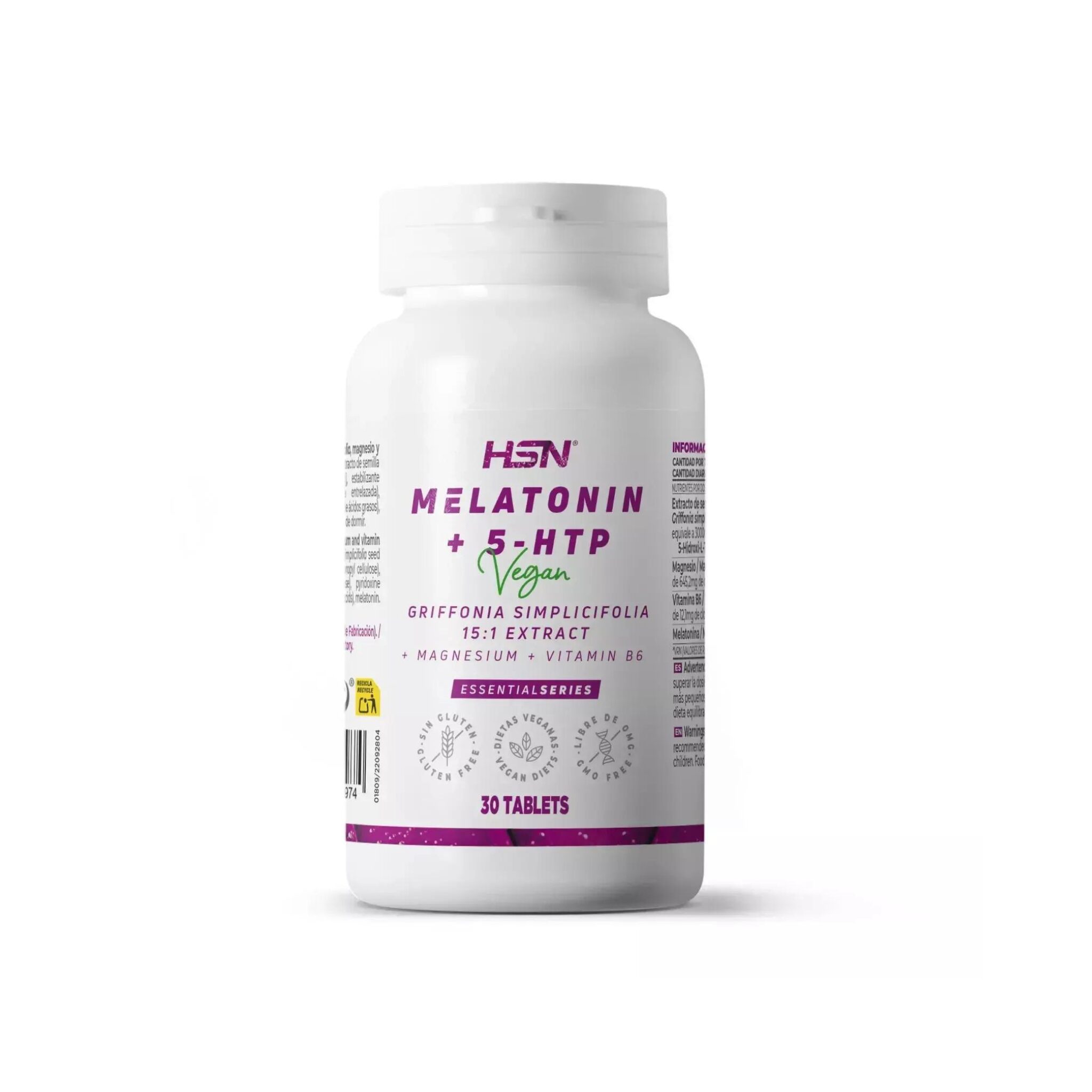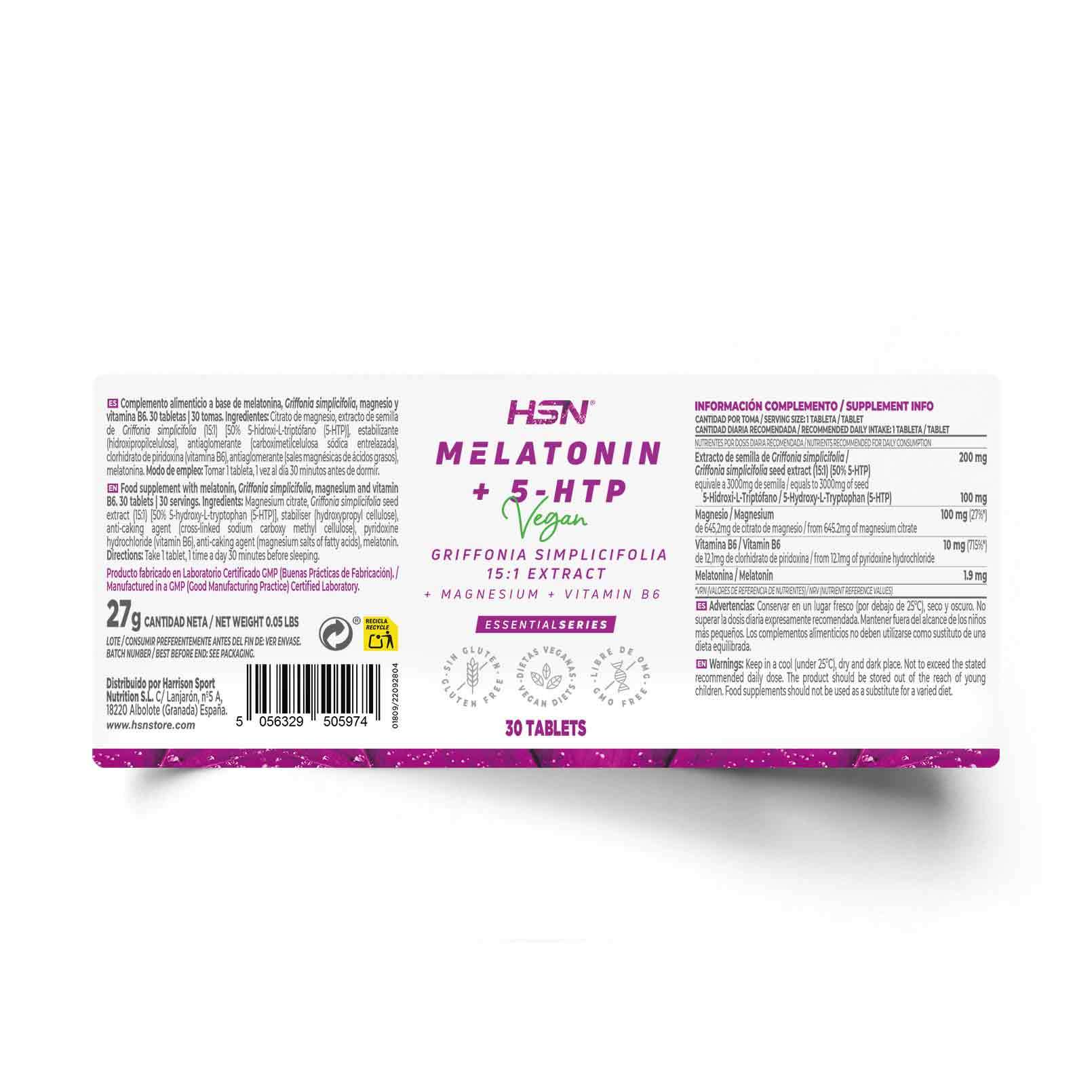 Melatonin + 5-HTP 1.9mg/100mg is a vegan-friendly supplement in convenient vegetable tablets, combining melatonin with a highly concentrated 16:1 extract of Griffonia simplicifolia seeds, standardized to 50% 5-HTP. Each tablet also provides magnesium and vitamin B6 to support nervous system function, reduce tiredness, and promote normal psychological function. Melatonin helps ease the subjective feeling of jet lag and supports faster sleep onset, while 5-HTP, derived from the amino acid L-tryptophan, contributes to mood and relaxation. This carefully formulated supplement ensures precise dosing and a potent, high-quality Griffonia extract for daily support.