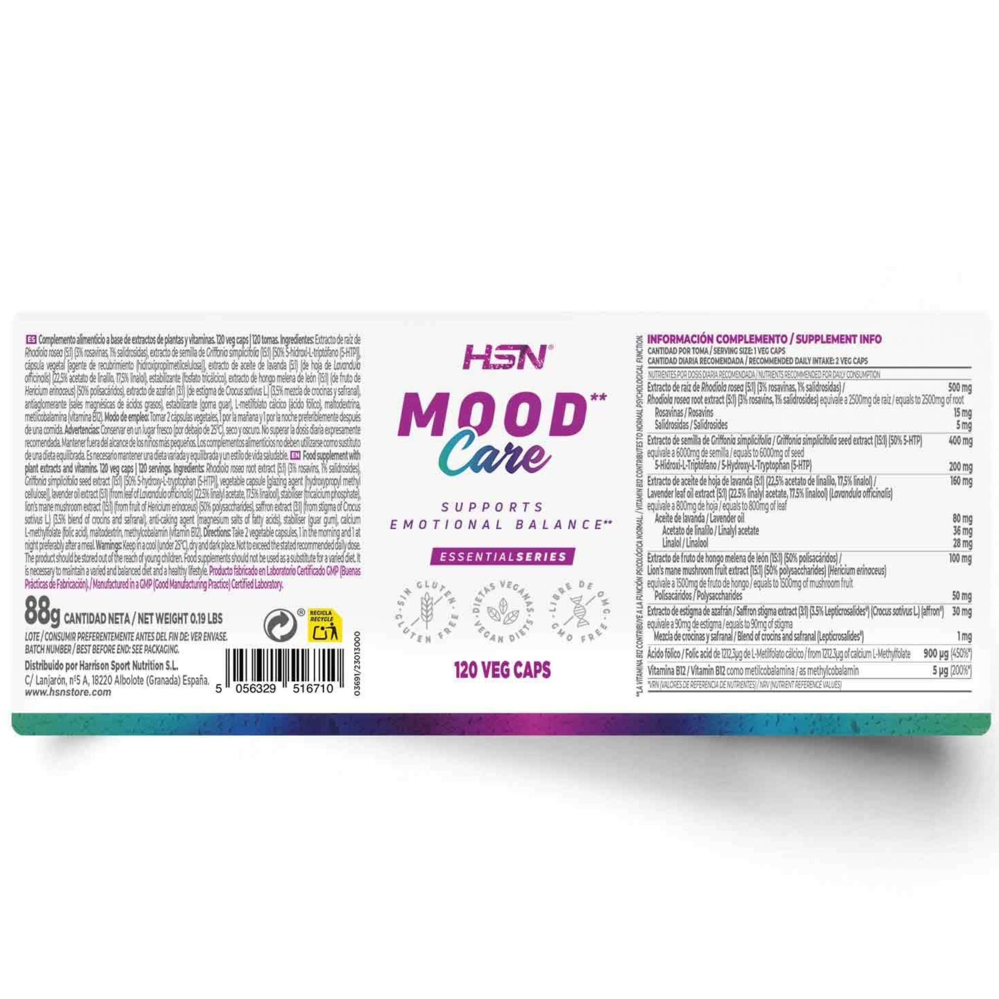 Rhodiola roseaz root extract (5:1, 3% rosavins, 1% salidrosides), Griffonia simplicifolia seed extract [15:1, 50% 5-hydroxy-L-tryptophan (5-HTP)], vegetable capsule [glazing agent (hydroxypropyl methylcellulose)], lavender oil extract (5: 1, from leaf of Lavandula officinalis, 22.5% linalyl acetate, 17.5% linalool), stabiliser (tricalcium phosphate), lion’s mane mushroom extract (15:1) (from fruit of Hericium erinaceus, 50% polysaccharides), saffron extract (3:1, from stigma of Crocus sativus L. , 3.5% mixture of crocin and safranal), anti-caking agent (magnesium salts of fatty acids), stabiliser (guar gum), calcium L-methylfolate (folic acid), maltodextrin, methylcobalamin (vitamin B12).