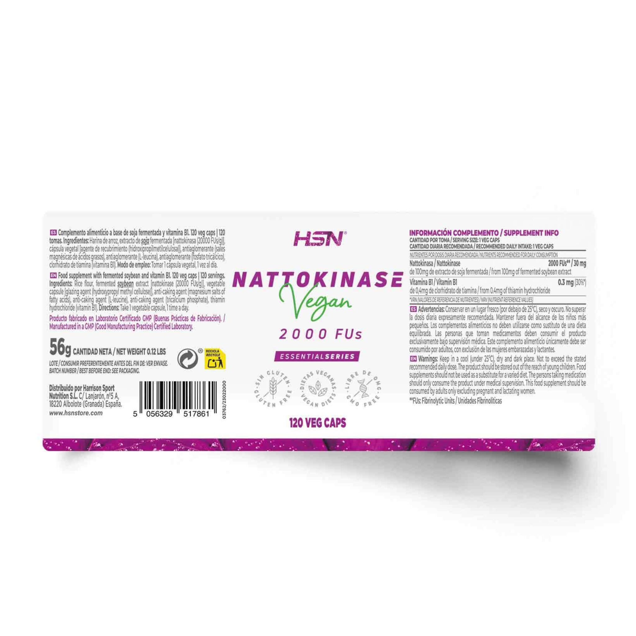 Rice flour, fermented soybean extract [nattokinase (20000 FUs/g)], vegetable capsule [glazing agent (hydroxypropyl methylcellulose)], anti-caking agent (magnesium salts of fatty acids), anti-caking agent (L-leucine), anti-caking agent (tricalcium phosphate), thiamine hydrochloride (vitamin B1).