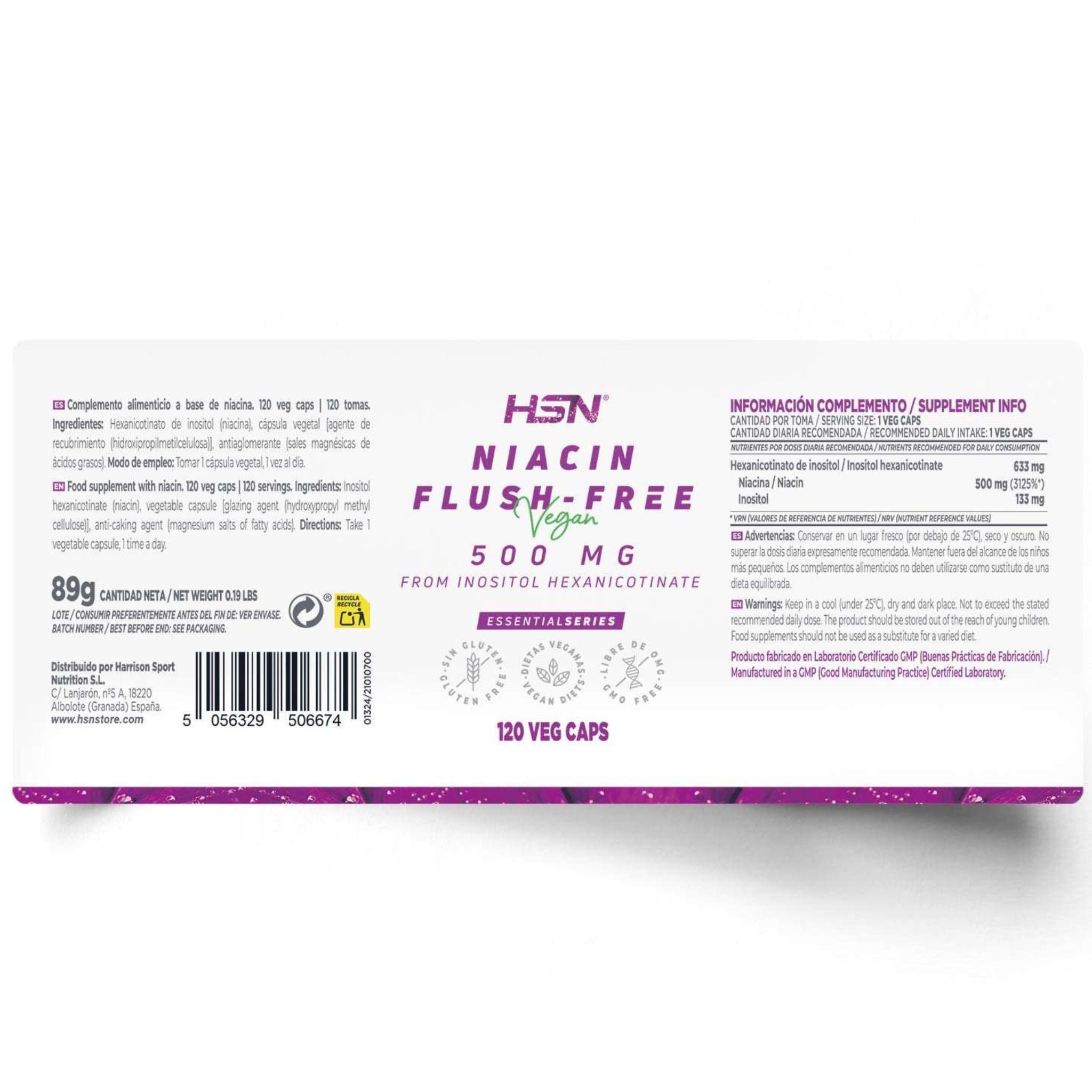 Inositol hexanicotinate (niacin), vegetable capsule [glazing agent (hydroxypropyl methyl cellulose)], anti-caking agent (magnesium salts of fatty acids).