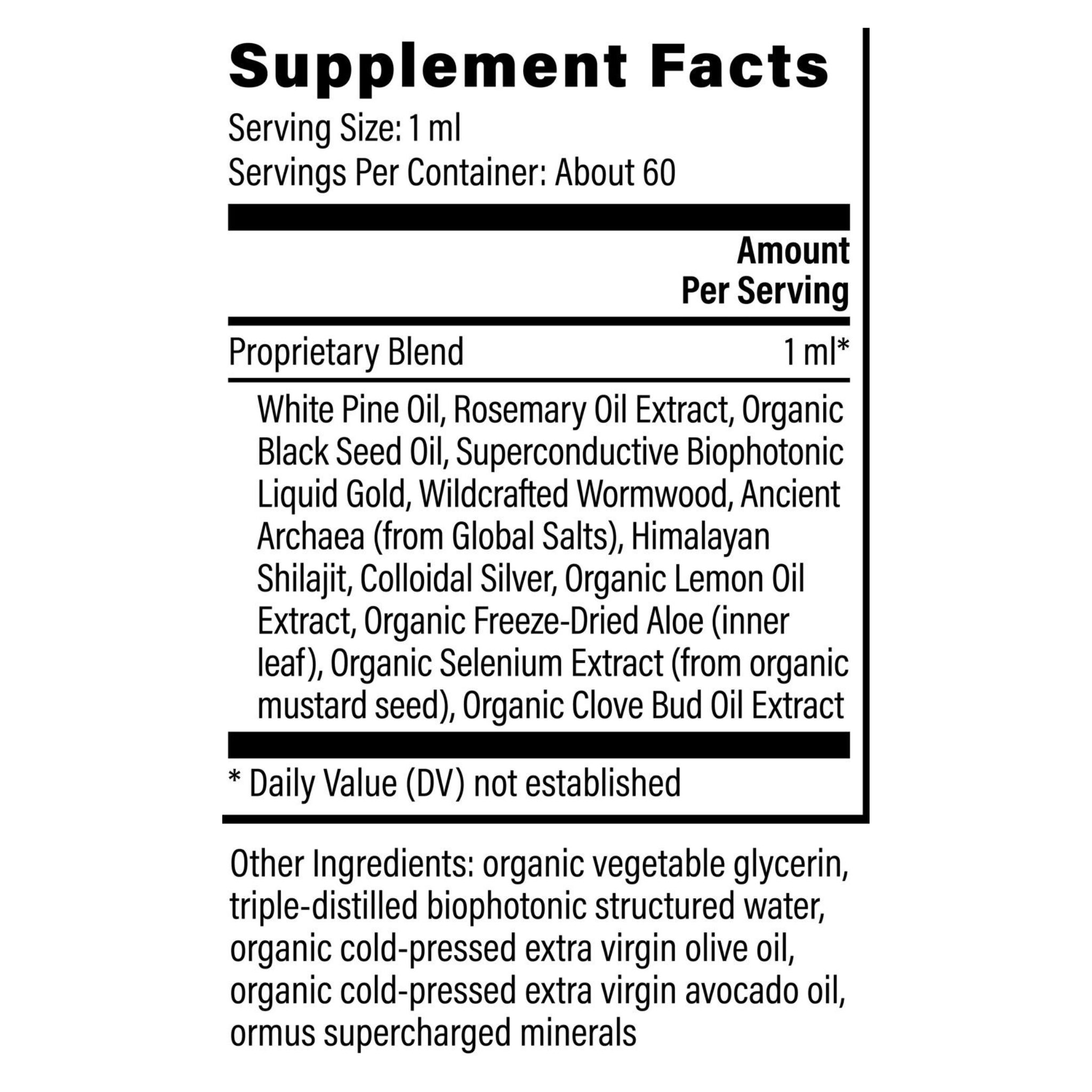 Propriety Blend: White pine oil, Rosemary oil extract, Organic Blackseed oil, Superconductive biophotonic liquid gold, wildcrafted wormwood, ancient archaea (from global salts), Himalayan Shilajit, colloidal silver, organic lemon oil extract, organic freeze-dried aloe (inner leaf), organic selenium extract (from organic mustard seed), organic clove bud oil extract.
