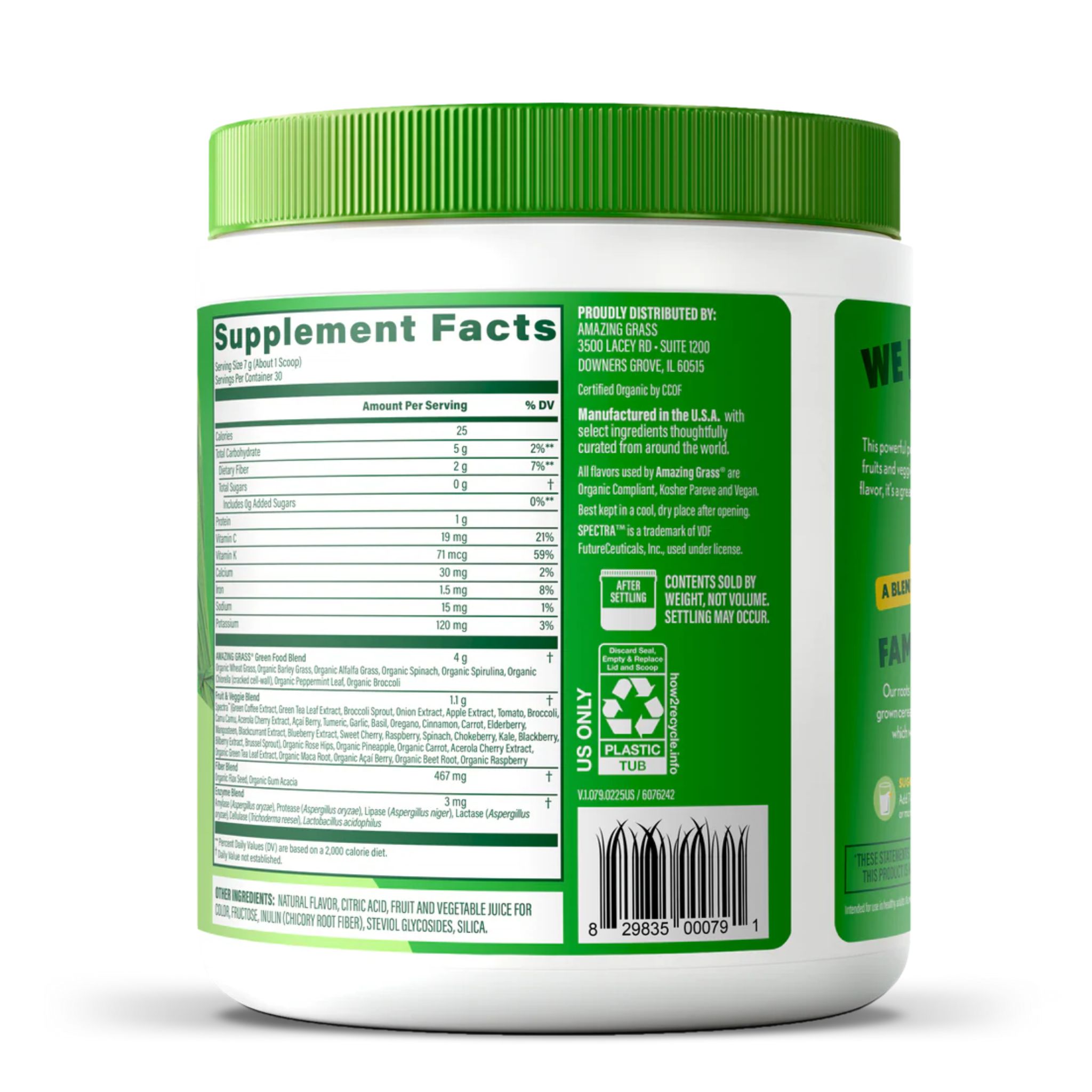 This nutrient-rich blend supports digestion and detoxification with probiotics and enzymes, while enhancing energy levels and strengthening the immune system. It features powerful alkaline green plant foods to help maintain pH balance, along with organic whole-leaf greens, Sambazon organic pure acai, and organic maca. Each serving delivers an impressive antioxidant boost of 15,000 ORAC units, thoughtfully crafted from alkalizing farm-fresh greens and wholesome fruits and vegetables. Rooted in a three-generation family farm in Kansas, Amazing Grass continues to grow and harvest some of the most nutrient-dense greens on earth, partnering with like-minded farmers worldwide to create high-quality, plant-based products that nourish the body and help you feel your best every day.
