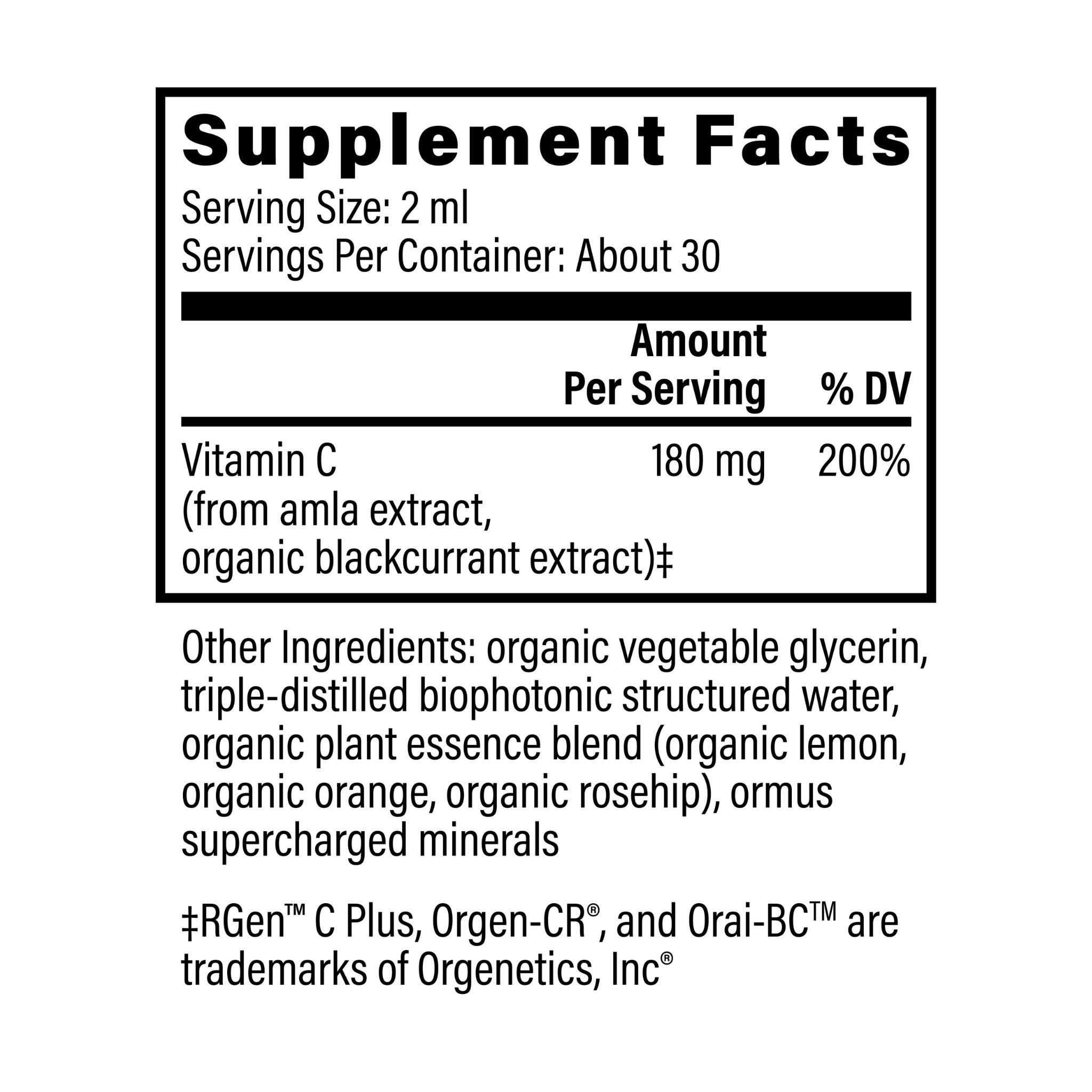 Other Ingredients: organic vegetable glycerin, triple-distilled biophotonic structured water, organic plant essence blend (organic rosehip, organic Sweet orange, organic lemon), Ormus supercharged minerals Orgen-CR°, and Orai-BC” are trademarks of Orgenetics, Inc