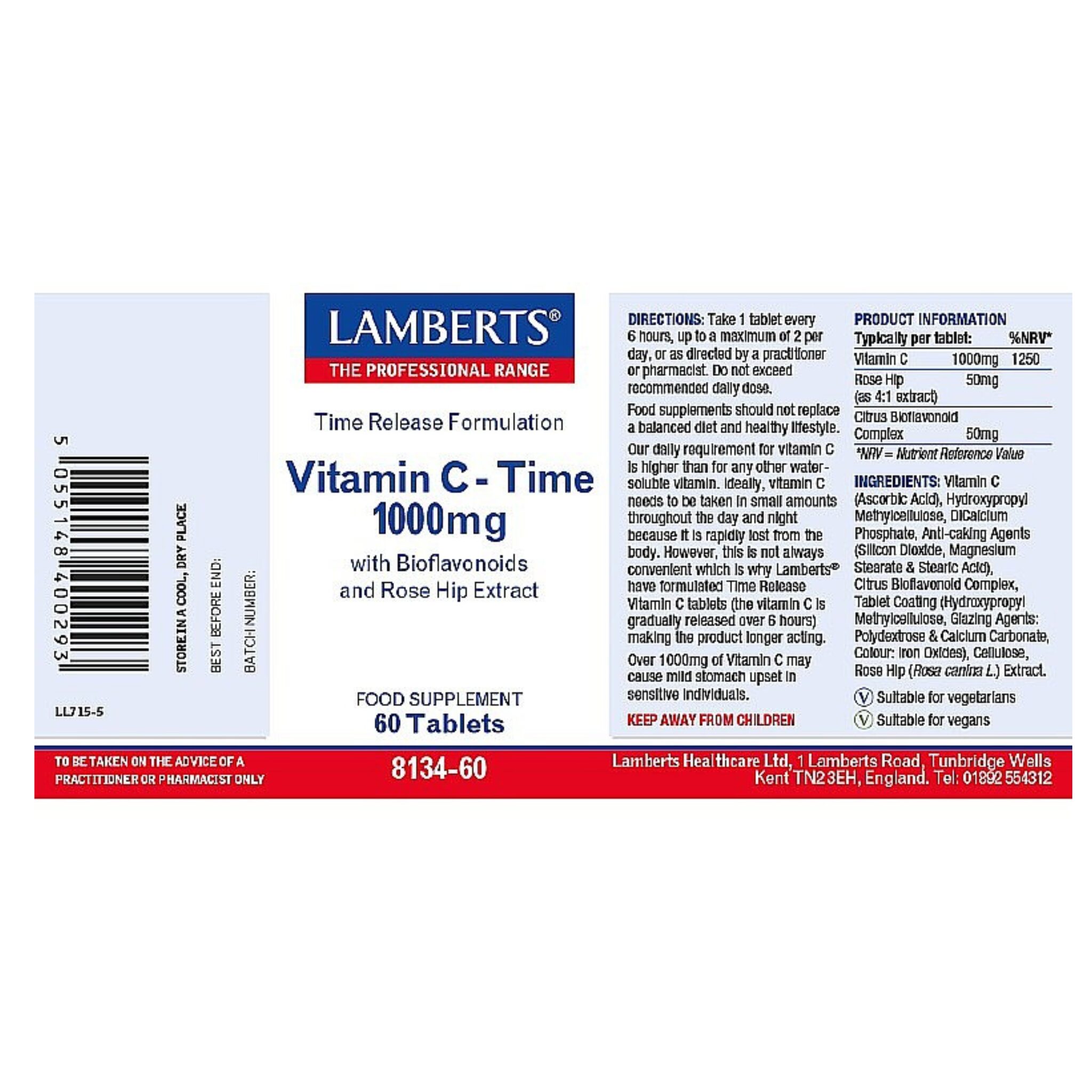 Lamberts® Time Release Vitamin C 1000mg tablets offer a steady release of vitamin C over 6-8 hours, ensuring a consistent supply to support collagen formation, nervous system function, and protect cells from oxidative stress. Each tablet is enhanced with bioflavonoids, the natural compounds found in fruits and vegetables, for improved absorption and effectiveness. This time-release formula helps maintain balanced vitamin C levels throughout the day, making it a convenient and powerful addition to your daily routine.