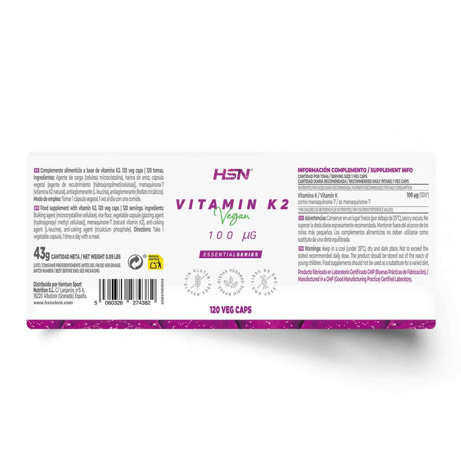 Bulking agent (microcrystalline cellulose), rice flour, vegetable capsule [glazing agent (hydroxypropyl methyl cellulose)], menaquinone-7 (natural vitamin K2), anti-caking agent (L-leucine), anti-caking agent (tricalcium phosphate).
